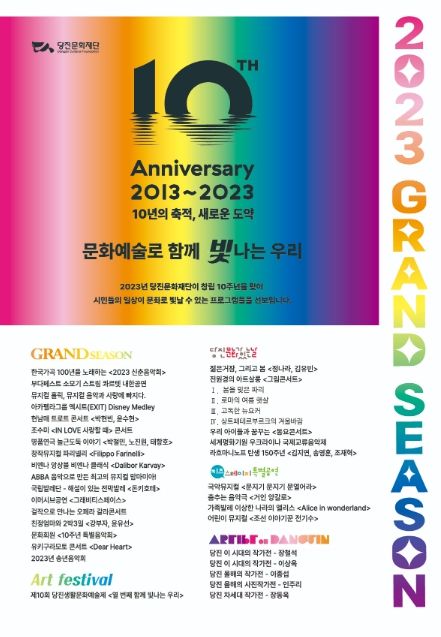 [제주교통복지신문 김강석 기자] 당진문화재단은 2023년 당진문예의전당 프로젝트명을 '문화예술로 함께 빛나는 우리'라는 타이틀을 가지고 공연, 전시 프로그램 등 35개의 GRAND SEASON을 공개하며, 성공적인 국비유치 소식을 알렸다.