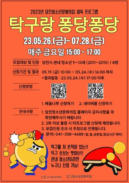 당진청소년문화의집에서‘2023년 체육 프로그램 [탁구랑 퐁당퐁당]’이외에도 청소년어울림마당, 2023 디베이트 프로그램 등 다양한 프로그램이 진행될 예정이니 청소년 및 학부모의 많은 관심과 신청 바란다.