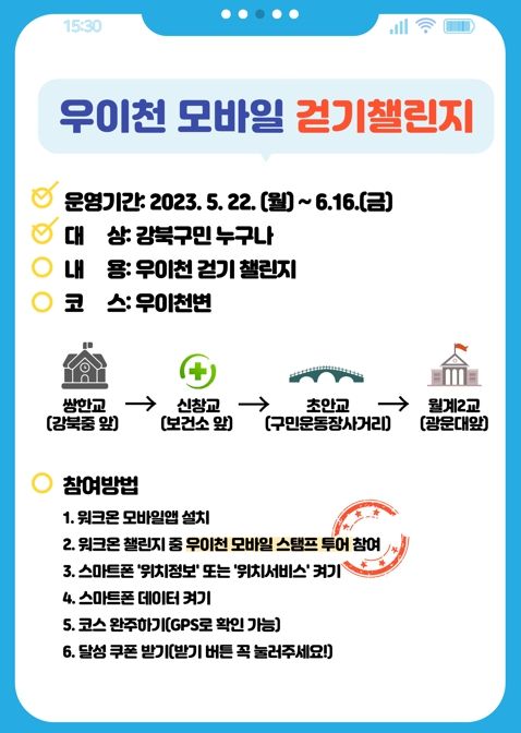 챌린지는 모바일 앱 ‘워크온’에서 5월 22일(월)부터 6월 16일(금)까지 진행된다. 챌린지 참여희망자는 스마트폰에 걷기 앱 워크온을 설치한 후 ‘우이천 모바일 걷기 챌린지’를 눌러 동참하면 된다.