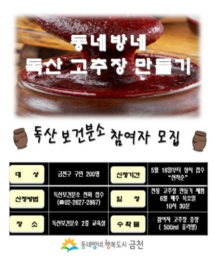 [제주교통복지신문 김강석 기자] 금천구는 독산보건분소와 박미보건지소에서 6월부터 ‘동네방네 고추장 만들기’ 프로그램을 운영한다.