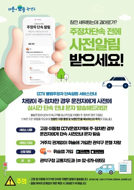 [제주교통복지신문 김강석 기자] 관악구가 오는 6월 1일부터 불법주‧정차 단속을 운전자 휴대폰으로 미리 알려주는 ‘불법주‧정차 단속알림 서비스’를 시행한다.