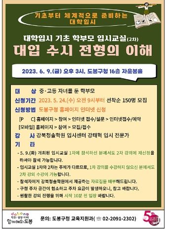 신청은 5월 24일 오전 9시부터 도봉구청 홈페이지(참여→인터넷접수/예약)에서 가능하며 선착순 150명을 모집한다. 입시 교실과 관련한 자세한 사항은 도봉구 교육지원과로 문의 가능하다.