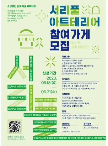 서울 서초구는 지역 예술가와 함께 상권 내 점포 안팎 디자인을 개선토록 지원하는 ‘2023년 서리풀 아트테리어’ 사업을 실시한다. 오는 31일까지 참여 가게와 예술가들을 모집한다.