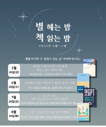 [제주교통복지신문 김강석 기자] 종로구가 이달부터 오는 11월까지 매월 마지막 주 저녁 청운문학도서관 한옥 세미나실에서 '별 헤는 밤, 책 읽는 밤' 북토크 프로그램을 선보인다.