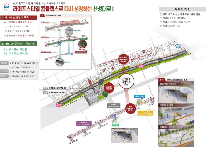 산성대로 일대 도시재생사업은 두 단위 사업으로 구분된다. 첫째는 산성대로 콤플렉스 사업으로 지하철 8호선 수진역에서 우리은행 사거리에 이르는 길이 1.3km, 폭 15~26m의 광장형 산책로인 녹지형 보행광장을 조성하는 것이다. 광장형 산책로는 도심 속 휴식 공간이자 문화공간으로 시민들이 연중 이용할 수 있도록 조성된다.