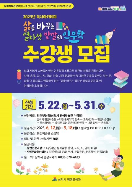 [제주교통복지신문 김강석 기자] 삼척시는 5년 연속 공모에 선정된 2023년 독서아카데미 『삶을 바꾸는 열다섯 빛깔의 인문학』 수강생을 모집한다고 밝혔다.