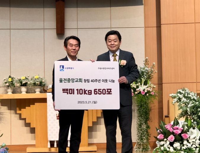 [제주교통복지신문 김강석 기자] 수원 율전중앙교회가 창립 40주년을 맞아 수원시휴먼서비스센터에 쌀 6500kg(10kg 650포)을 기부했다.