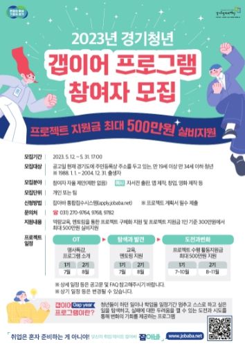 민선8기 김동연 경기도지사의 핵심 공약 중 하나인 ‘경기청년 갭이어 프로그램’은 경기 청년들의 자율성을 보장하며 도전의 기회를 제공하는 프로그램이다. 나에 대한 탐색이 필요한 경기청년, 나의 꿈을 구체화하고 싶은 경기청년, 전환의 기회가 필요한 경기청년 등 다양한 경기청년에게 폭넓은 도전의 기회를 제공할 예정이다.