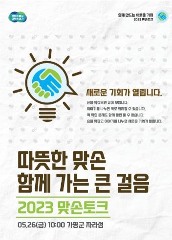 한편, 맞손토크는 작년 도지사-시장․군수 간담회 시 합의에 따라 시작해 7번째를 맞이했다. 화성시 100인 기업인과의 맞손토크, 광명시 기후위기 대응 맞손토크 등 지역별 현안을 반영한 주제를 선정해 도민과의 다양한 소통을 이어가고 있다.