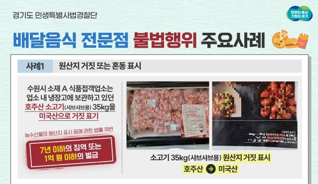 주요 적발 사례를 보면 수원시 소재 A 식품접객업소는 업소 내 냉장고에 보관하고 있던 호주산 소고기(35kg)의 원산지를 미국산으로 거짓 표시해 적발됐다.