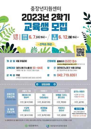 [제주교통복지신문 김강석 기자] 대전시가 지원하고 대전일자리경제진흥원이 운영하는 중장년지원센터가 내달 6월 7일부터‘2023년 2학기 교육과정’ 교육생을 모집한다고 22일 밝혔다.