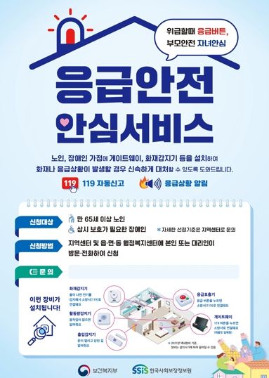 신규 대상자 1만 2천 가구를 발굴하는 ‘독거노인·장애인 응급안전안심서비스’ 신청은 오는 31일까지 읍면동 행정복지센터나 노인복지관·노인복지센터·지역자활센터 등 지역센터에 본인 또는 대리인이 방문·전화로 신청하면 된다.