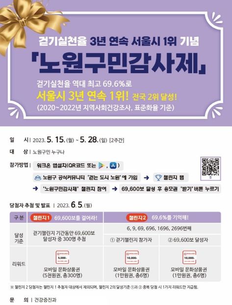 구는 이번 성과의 주역인 구민들에게 감사의 마음을 담아, 걷기챌린지 ‘노원구민감사제’를 오는 28일(일)까지 진행한다.