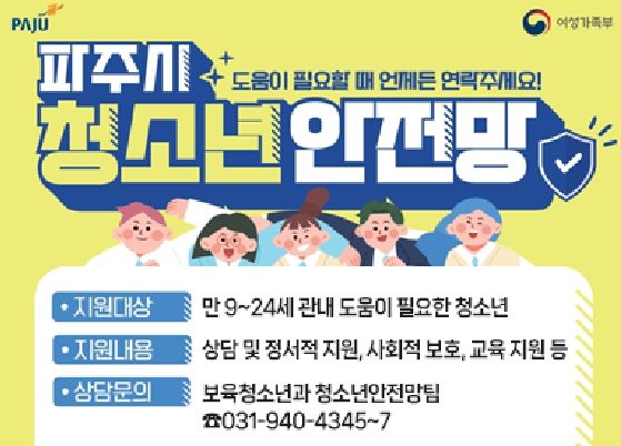 [제주교통복지신문 김강석 기자] 파주시는 청소년안전망 사업을 통해 위기청소년 발굴, 맞춤형 연계서비스 제공 및 사후관리(모니터링) 등의 통합지원을 추진하고 있다. 청소년안전망이란 복합적인 문제에 노출되어 도움이 필요한 위기청소년에게 지역사회 자원을 연계해 맞춤형서비스를 제공해 사회 및 학업복귀 등을 지원하는 사회안전망 시스템이다.