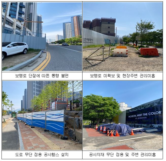 시는 지난 4월 말 검단신도시 AA13구역 아파트 건설 현장에서 발생한 지하 주차장 붕괴 사고와 관련, 5월 3일 해당 건설 현장 주변 공공시설의 안전 문제 등 시민 불편 사항이 있는지 생활밀착시설 긴급 점검을 실시해, 도로 무단 점·사용 등 위법사항을 적발하고 관할 기관에 시정 조치를 요구한 바 있다.