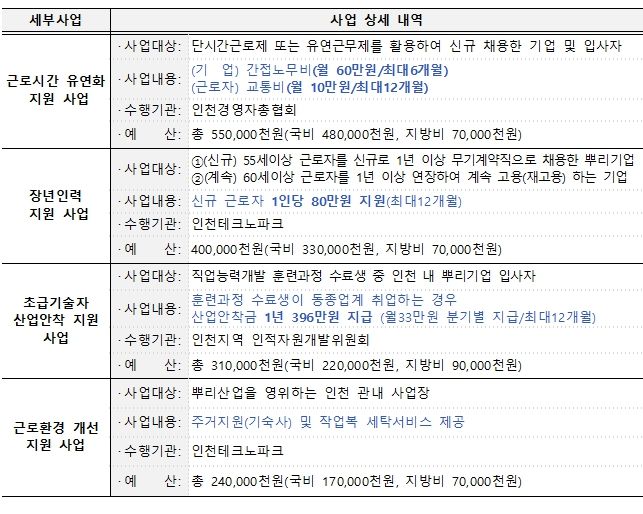 시는 이 사업비를 인천지역의 주력산업인 뿌리업종의 경우 고령화, 저임금, 장시간 근로환경으로 만성적 인력난을 겪고 있어 신규인력의 유입 촉진과 숙련인력의 고용 유지를 위해 지원한다.