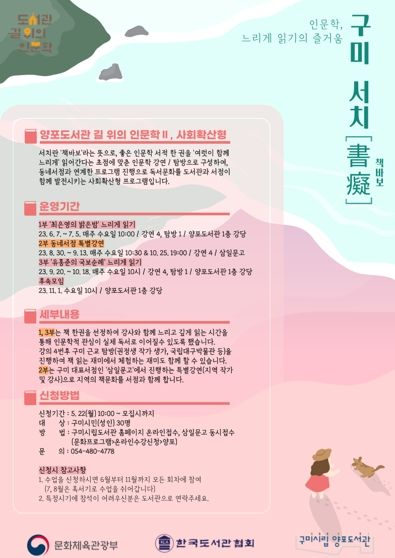 [제주교통복지신문 김강석 기자] 구미시립중앙도서관은 22일부터 양포도서관에 운영하는 '인문학 느리게 읽기의 즐거움, 구미 서치' 참여자를 모집한다.