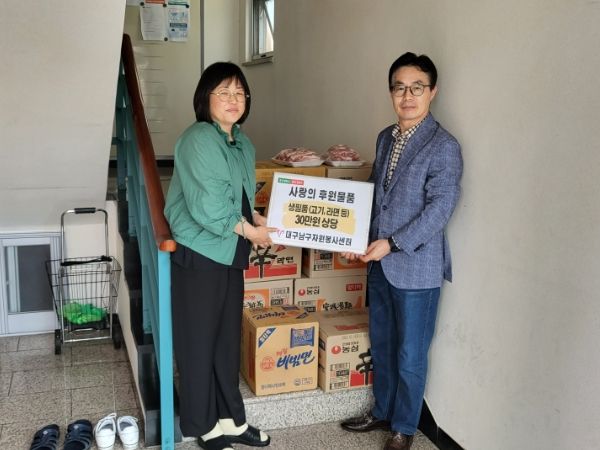 [제주교통복지신문 김강석 기자] 대구광역시 남구청은 대구 남구자원봉사센터에서 지난 2023년 남구 앞산축제에 체험부스를 운영하여 모은 수익금 30만원으로 대구에 있는 여성폭력피해자 지원시설에 생필품(돼지고기, 라면)을 전달했다고 22일 밝혔다.