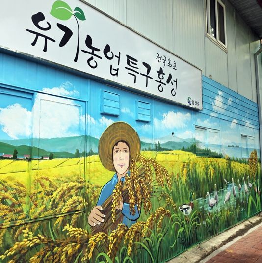 홍성군청 별관(구 홍성읍사무소) 좌측 외벽에 그려진 이번 벽화는 가로 8.5m, 세로 4m짜리 작품으로, 홍성군을 유기농업의 메카로 부상시킨 오리농법, 생물을 이용한 제초 일꾼 우렁이와 황금빛 친환경 들녘을 이미지화했다.