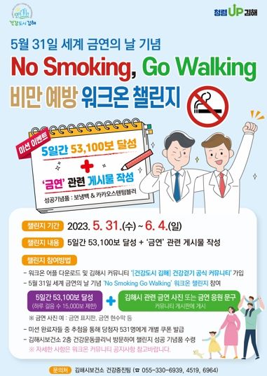 [제주교통복지신문 김강석 기자] 김해시보건소는 5월 31일 ‘세계 금연의 날’을 맞이하여 “No Smoking, Go Walking” 워크온 챌린지를 실시한다고 밝혔다.