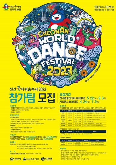 [제주교통복지신문 김강석 기자] (재)천안문화재단은 문화체육관광부 선정 명예문화관광축제 ‘천안흥타령춤축제 2023’의 춤 경연 대회 참가팀을 모집한다고 22일 밝혔다.