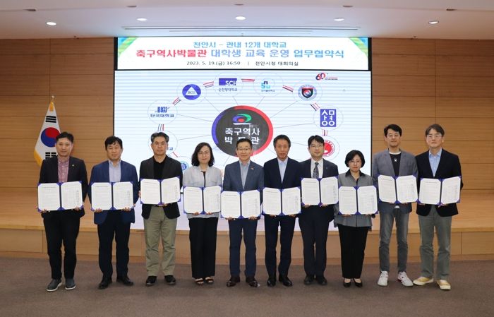 [제주교통복지신문 김강석 기자] 천안시는 지난 19일 시청 대회의실에서 지역 내 12개 대학교 학생처장들이 참석한 가운데 ‘축구역사박물관 대학생 교육프로그램 운영’을 위한 업무협약을 체결했다고 밝혔다.