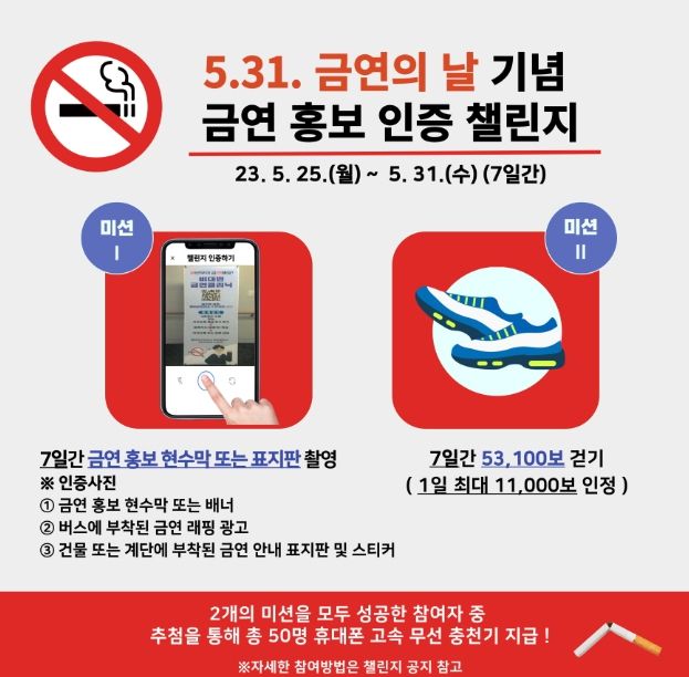 군은 생활 속 걷기운동 실천을 유도하고 금연 환경을 조성하기 위해 걸음 수를 달성하고 홍보물 사진을 게시한 후 응모하기를 완료한 참가자 중 추첨을 통해 50명에게 휴대폰 고속 무선 충전기를 제공할 계획이다.