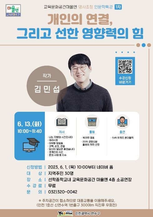 [제주교통복지신문 김강석 기자] 인천시 연수구는 6월 13일 구민을 대상으로 선학중학교 내 교육문화공간 ‘마을엔’에서 지역주민들에게 삶의 가치관에 대한 긍정적인 변화를 촉진하기 위한 인문학 특강 “개인의 연결, 그리고 선한 영향력의 힘”을 개최한다.