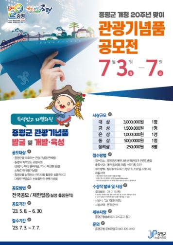 [제주교통복지신문 김강석 기자] 증평군은 군 개청 20주년을 맞이하여 증평을 대표하는 관광기념품을 발굴·육성하기 위해 2023년 증평군 관광기념품 공모전을 개최한다고 22일 밝혔다.