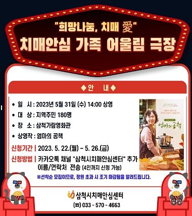 [제주교통복지신문 김강석 기자] 삼척시치매안심센터가 치매 관리의 중요성을 알리고 치매 극복을 위한 공감대 형성 및 치매 친화적 환경 조성을 위하여 “희망나눔, 치매 愛” 치매안심 가족 어울림 극장을 운영한다.