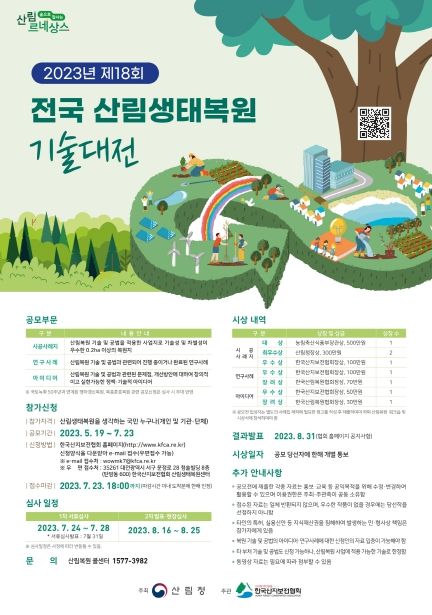 공모 부문은 산림생태복원 신기술 시공사례, 연구사례 및 아이디어이며, 국민 누구나 참가할 수 있다. 산림청 및 한국산지보전협회 누리집에서 신청양식을 내려받아 2023년 7월 23일까지 전자우편 또는 우편으로 접수하면 된다.