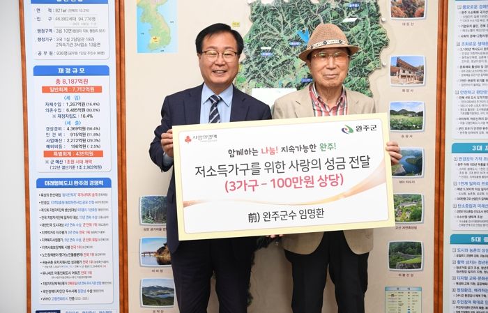 22일 완주군에 따르면 지난 19일 이뤄진 성금 전달식은 올해로 92세를 맞은 임명환 회장이 완주군청을 직접 방문하여 진행됐으며, 전달된 성금은 관내 어려운 이웃 3가구에 전달될 예정이다.