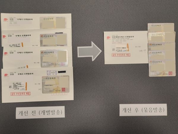 2매 이상의 주민등록증을 동일 시·군·구로 발송하는 경우에도 개별 발송 방식으로 우편물을 발송해 건별 등기우편 요금(통당 2,530원)이 부과됨에 따라 우편요금이 증가하고 불필요한 업무절차가 발생됐다.