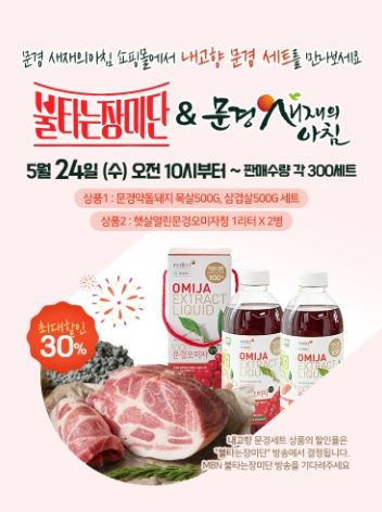특히 방송이 종료된 다음 날인 24일(수요일) 10시부터 문경새재의아침 쇼핑몰에서 문경약돌돼지와 문경오미자청 각 300set를 최대 30% 할인하여 선착순 판매한다.