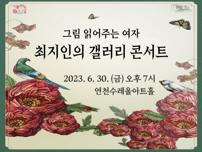 [제주교통복지신문 김강석 기자] 연천수레울아트홀은 6월 문화가 있는 날을 맞이하여, 6월 30일 금요일 19시 ‘그림 읽어주는 여자 '최지인의 갤러리 콘서트'’를 공연한다. '최지인의 갤러리 콘서트'는 MBN 아나운서 출신 최지인 작가가 자유와 희망에 관한 음악과 함께 본인의 그림에 담긴 이야기를 전하는 콘서트이다.