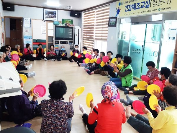 건강체조교실은 건강마을조성사업 지역인 청송읍의 13개 경로당 어르신을 대상으로 5 ~ 6월까지 주1회 운영하고 있으며, 자격을 소지한 건강지킴이가 각 마을의 경로당을 방문하여 건강체조, 하지근력 강화운동, 레크레이션(음악·율동·게임) 등을 함께하는 건강프로그램이다.