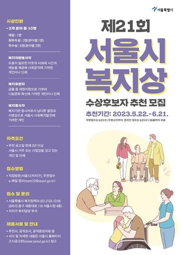 후보자 추천 제출 서식 및 안내는 서울시 누리집이나 서울복지포털에서 ‘제21회 서울시 복지상 추천 공고’를 통해 확인할 수 있다.