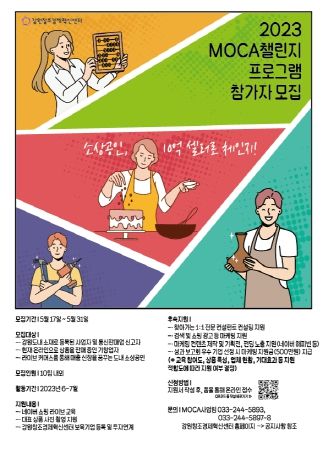 [제주교통복지신문 김강석 기자] 강원창조경제혁신센터가 도 내 소상공인 온라인 쇼핑몰 창업의 안정적인 정착과 매출 상승을 지원하기 위해 추진하는 ‘2023년 온라인판로개척사업(MOCA챌린지) 프로그램의 참가자를 오는 31일까지 모집한다고 밝혔다.