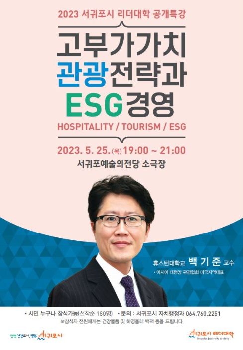 [제주교통복지신문 김현석 기자] 서귀포시 리더대학은 오는 5월 25일 19시부터 21시까지 서귀포예술의전당 소극장에서 『고부가가치 관광전략과 ESG 경영』이라는 주제로 백기준 휴스턴대 교수를 초청하여, 서귀포시민을 대상으로 공개강좌를 연다.