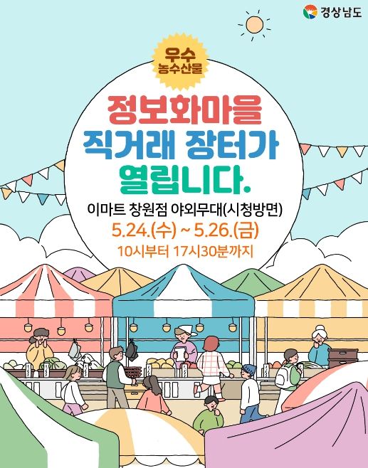 [제주교통복지신문 김강석 기자] 경상남도는 오는 24일부터 26일까지 3일간, 이마트 창원점 야외무대에서 도내 12개 시군, 18개 정보화마을이 참여하는 ‘정보화마을 직거래장터’를 개최한다.