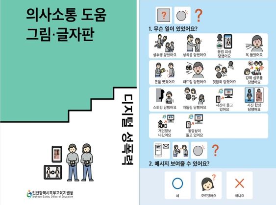 AAC(Augmentative Alternative Communication)는 언어적 어려움을 겪는 사람들이 사용하는 보조수단으로 그림이나 글자로 된 판을 이용해 의사소통을 돕는 도구다. 북부교육지원청은 지난해부터 언어치료 AAC센터 사람과 소통(대표 한선경), 인천 관내 학교폭력 책임교사, 특수교사, 경찰관 등과 함께 디지털 성폭력의 다양한 사례를 분석하고 현장 검토 등을 거쳐 AAC를 개발했다.