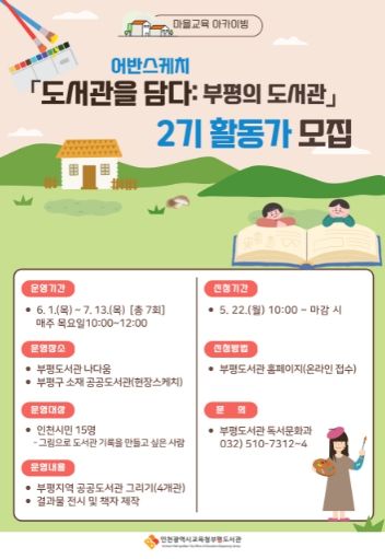 ‘도서관을 담다: 부평의 도서관’은 부평구에 있는 공공도서관을 직접 방문해 그림으로 그려 지역의 자료를 구축하는 마을 아카이빙 사업이다. 2기 활동가는 6월 1일부터 7월 13일까지 7회 동안 부개도서관 등 부평구 소재 4개 공공도서관의 모습을 수집할 예정이다. 수집된 자료는 온·오프라인 전시회를 통해 공유하고, 책자로 편집·제작해 지역 교육자료로도 활용할 방침이다.
