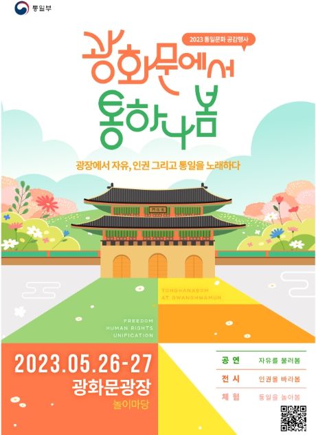 5월 26일 오후 1시부터 27일 저녁 8시까지 광화문광장 놀이마당에서 열리는 2023 통일문화 공감행사'광화문에서 통하나봄'은 국민의 통일에 관한 관심을 높이고, 자연스럽게 통일 미래를 생각해 볼 수 있는 소통의 장이다.