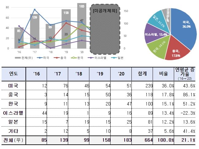 연평균 증가율은 중국(86.1%)이 가장 높았고, 한국은 연평균 51.2%로 2위를 차지했으며, 다음은 미국(43.6%), 일본(13.6%), 이스라엘(-22.3%) 순이었다.