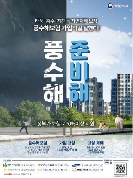 풍수해보험은 태풍, 호우·지진 등 9개 자연재난으로 발생하는 재산피해를 보상해 주는 정책보험으로, 가입 시 총 보험료의 70% 이상을 국가와 지방자치단체에서 지원하고 있다.