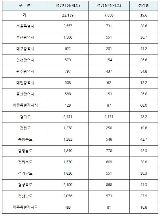 올해 집중안전점검은 지난 4월 17일 시작되어 오는 6월 16일까지 총 29,689개소의 안전취약시설을 대상으로 실시하고 있다.