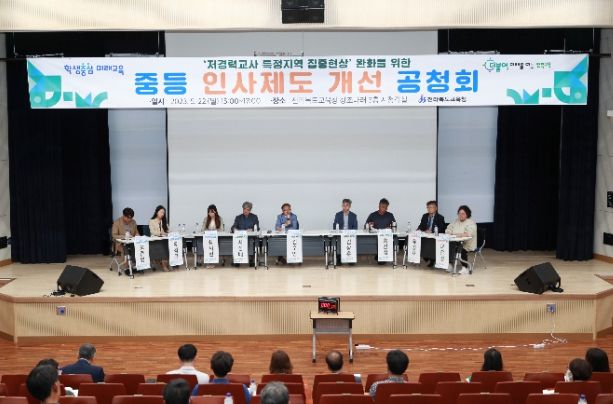 전북교육청은 22일 창조나래(별관) 시청각실에서 저경력교사 특정 지역 집중 현상 완화 방안 마련을 위한 ‘중등 인사제도 개선 공청회’를 개최했다고 밝혔다.