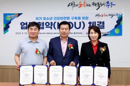 [제주교통복지신문 김강석 기자] 대구 중구는 5월 22일 대구광역시 행복진흥사회서비스원, 대구광역시중구약사회와 함께 ‘위기 청소년 건강안전망 구축을 위한 업무협약’을 체결했다.