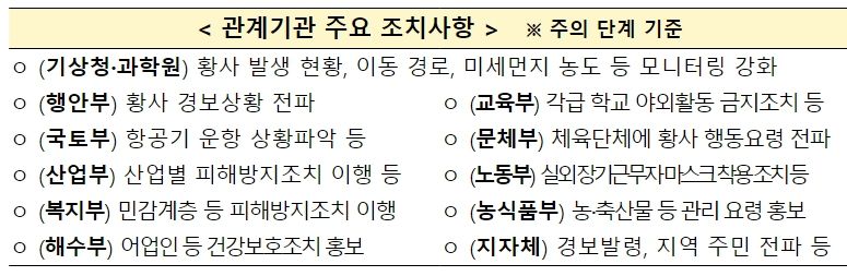황사 위기경보 ‘주의’ 단계가 발령됨에 따라 환경부는 관계 기관과 해당 지자체에 곧바로 상황을 전파하고, ‘황사 대응 매뉴얼’에 따라 철저하게 대응할 것을 요청했다.