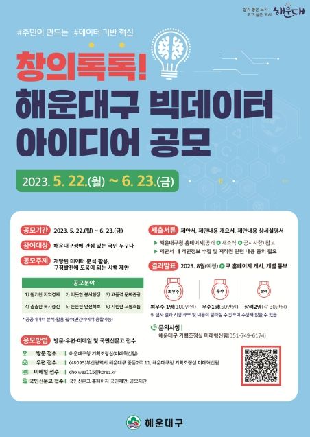[제주교통복지신문 김강석 기자] 해운대구는 ‘살기 좋은 도시, 오고 싶은 도시 해운대’ 비전 실현을 위한 ‘창의 톡톡! 빅데이터 아이디어 공모전’을 실시한다.